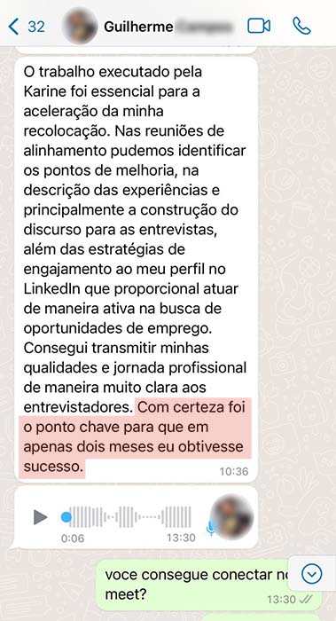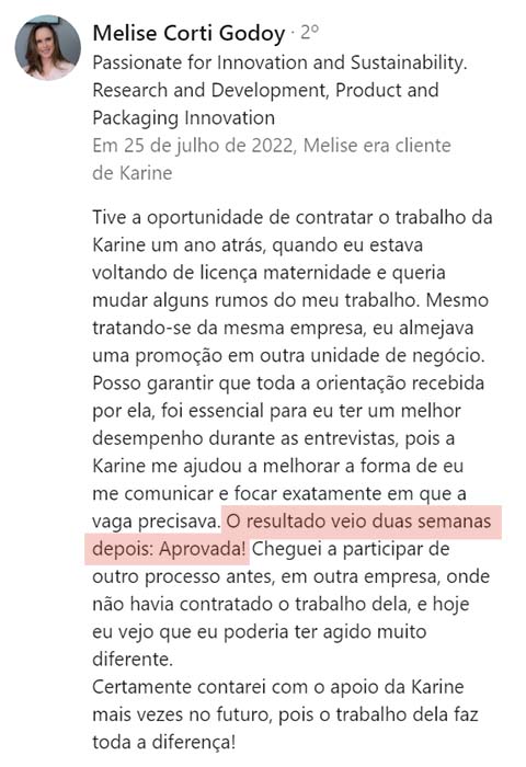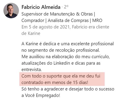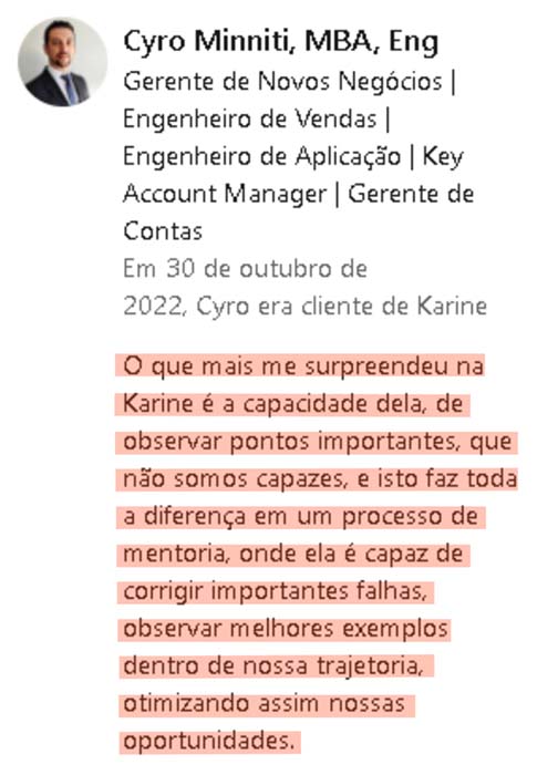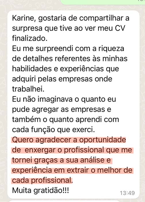“(…) pudemos identificar os pontos de melhoria, na descrição das experiências e principalmente a construção do discurso para as entrevistas(…) Consegui transmitir minhas qualidades e jornada profissional de maneira muito clara aos entrevistadores.”