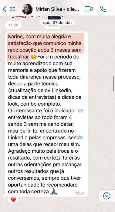 “Posso garantir que toda a orientação recebida por ela, foi essencial para eu ter um melhor desempenho durante as entrevistas…”